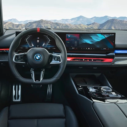 Upgrading to the i5 M60 means a leap in power and a host of new technology. Reducing driving range to 320 miles, as the electric motor draws an incredible 601hp of power from the batteries.